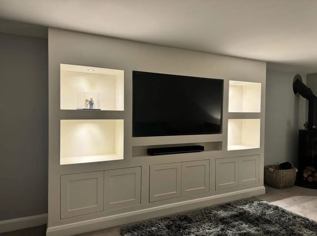 We specialise in bespoke media walls built entirely on site for a seamless, made-to-measure finish. Whether you want a custom media wall design, integrated storage, or a full feature wall, every project is tailored to your home and crafted with precision.